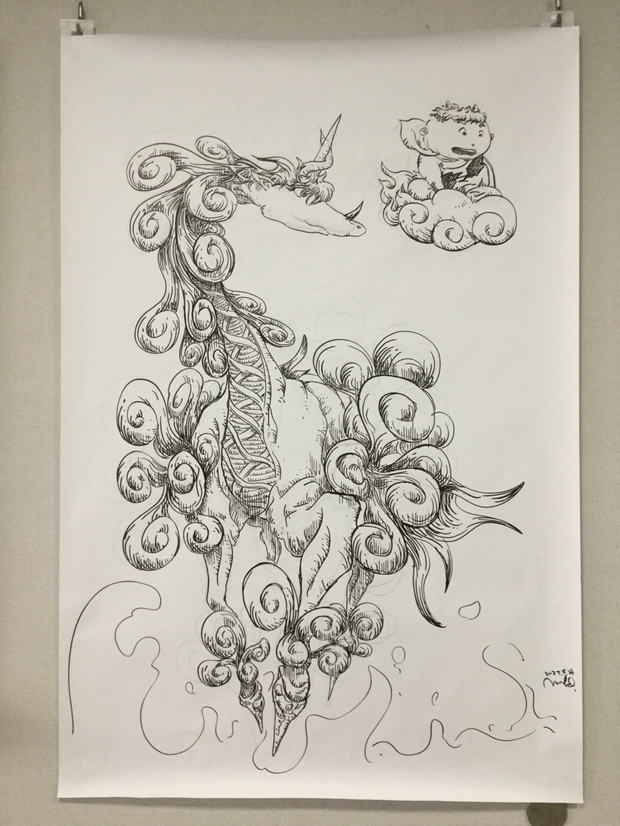 まあぼん 展覧会十七日目のライブドローイング、二枚目。 投稿者: murbo 投稿日: 2022/05/022022/05/03 大体一日一マイペースにしたいことと、最終日はバラシの関係上、描かないことにしたので二枚目を描いています。 急いでいるのでバランス悪いですね。 絵が荒い。 黒いので角端です。 ここで鼻先に角がないことに気が付きました。 紙に顔料インクマーカー。 関連記事: 展覧会十六日目のライブドローイング。 展覧会十七日目のライブドローイング、一枚目。 展覧会十八日目のライブドローイング。