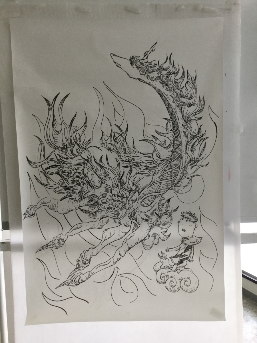 まあぼん 展覧会十七日目のライブドローイング、一枚目。 投稿者: murbo 投稿日: 2022/05/022022/06/06 麒麟。色はついていないが赤いので炎駒≪えんく≫。 惰性でなんとなく斜めになってしまった。 デザインはまだ固まっていない。 紙に顔料インクマーカー。 関連記事: 展覧会十六日目のライブドローイング。 展覧会十七日目のライブドローイング、二枚目。 展覧会十八日目のライブドローイング。