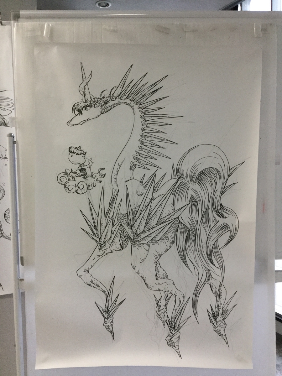 麒麟、ドローイングなので色が見えないが白い麒麟です。索冥≪さくめい≫。