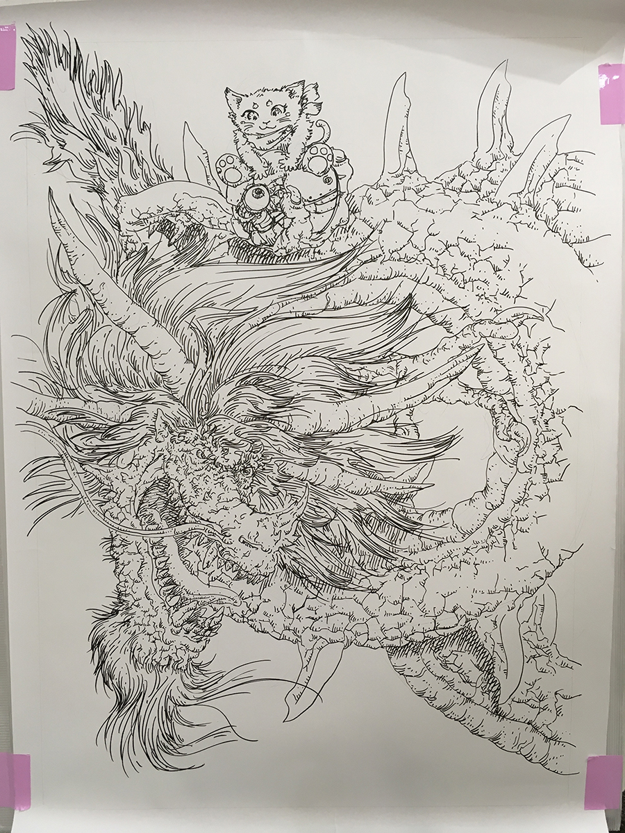 龍を描く時に毎度困っている鱗については、今回はこのような表現にしました。背鰭はナイフのデザインです。