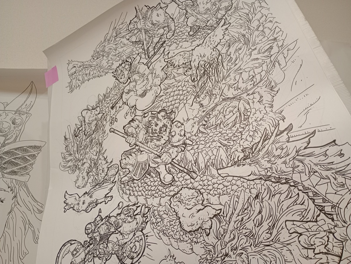 虎を描きました。ここに独立した絵やポーズにならないように、それぞれがある程度関連があるように描いています。