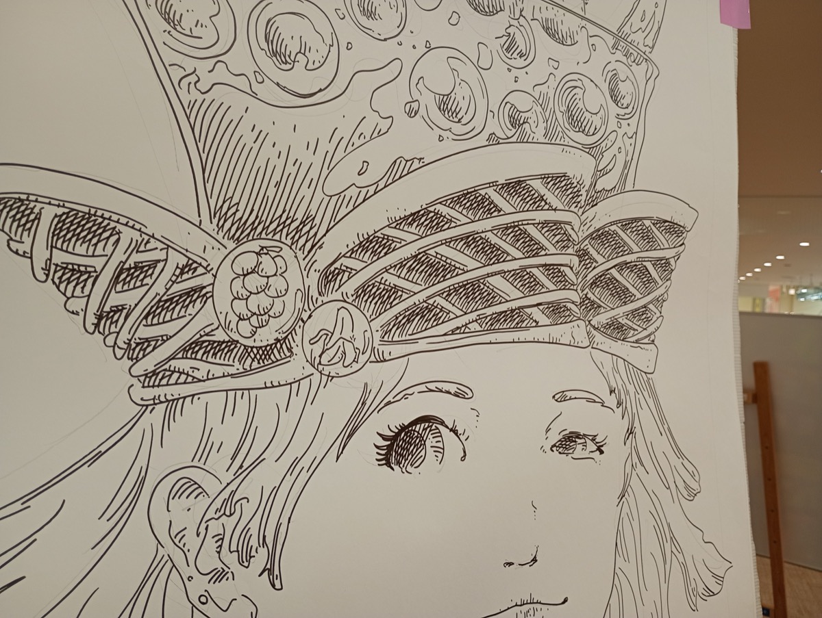 日記 会場での制作3。250913 投稿者: murbo 投稿日: 2025/09/142025/09/14 三枚目を描こうか迷って、スタートしました。 夕方になってきたのと、疲れてきたからです。 スケッチを二枚足して、その場でも要素を足します。写真が少なめなのは急いでいるからです。 子龍を入れるのを忘れたね。次回入れよう。 お菓子の帽子と顔アップなので似通った絵になるのはわかっていたので、表情とかメガネのようなわかりやすい物体を入れて変化をつけようとしています。 どうにか今回も三枚描けた。来週も描きます。 Readers who viewed this page, also viewed:ライブドローイング250816 関連記事: ライブドローイング250816 会場でのライブドローイング1。250830 会場でライブドローイング3。250906