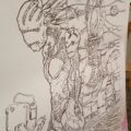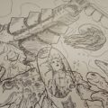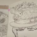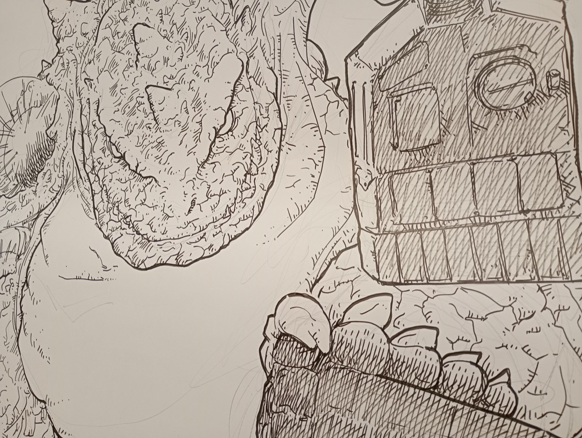 日記 会場での制作3。250927 投稿者: murbo 投稿日: 2025/09/282025/09/28 三枚目です。どうしようかと思いましたが、二時間で描ける!と、予想して描きます。 オリジナルの怪獣、ドテドンです。これを描くときに毎回紙より大きくなったり、手足の位置があやふやに思えてしまう。 戦車は課題だ。めっちゃ砲身が大きいw 車体もディティール一向に足らない。これに関しては後日加筆します。 関連記事: 会場でライブドローイング2。250906 会場でライブドローイング3。250906 会場での制作1。250927