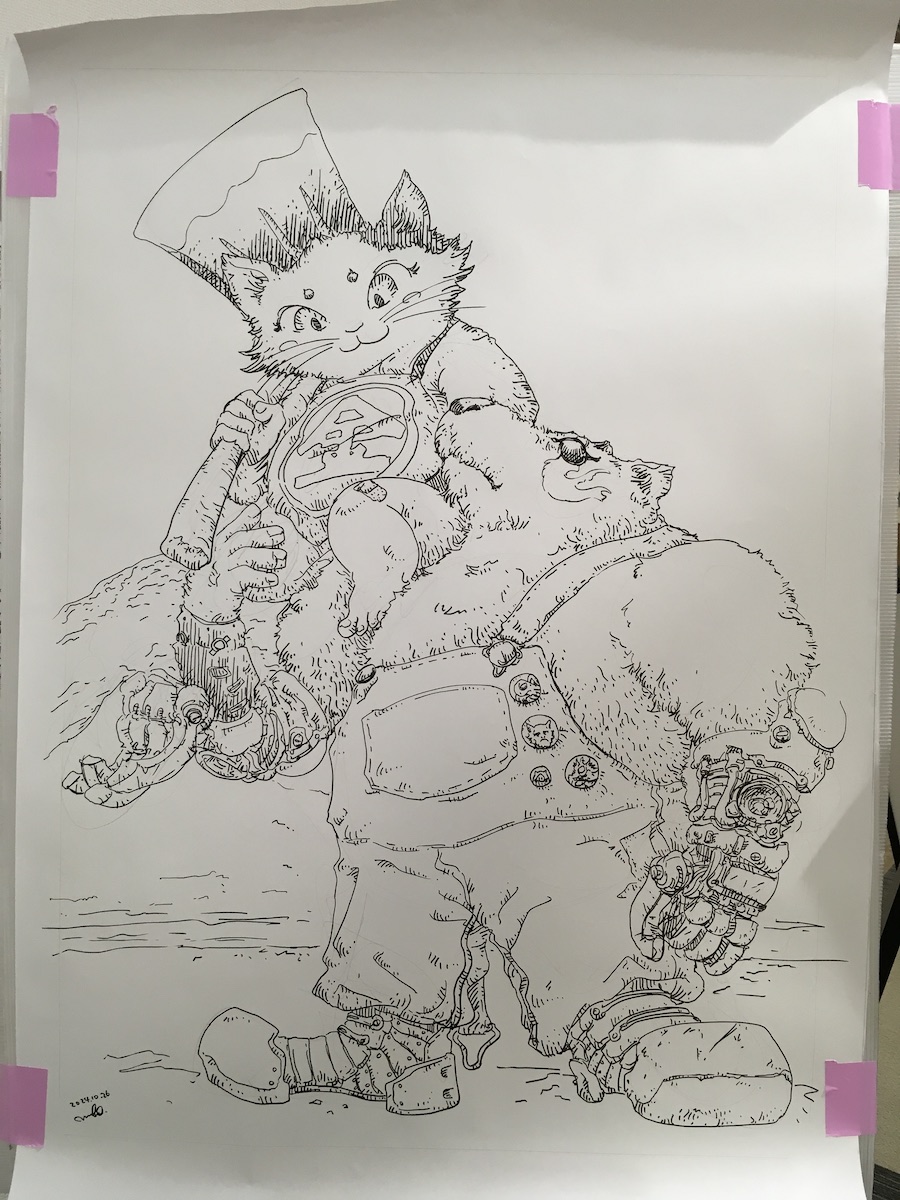 Picture livedrawing24102601. 投稿者: murbo 投稿日: 2024/10/282024/10/28 今回の展覧会での最後のライブドローイングでした。 午前中は毎度遅れ気味で到着するのでお昼までに描ける内容を選んでいます。そして早く描くためにあたりだけとっています。 デザインなどもその場で考えているので左右で違ったりしています。 パンツの裾などは会場の向かいがGUなので、実際に展示してあるパンツを見たりしています。 機械の珠chance and cobbled-together machine-made sphere. 関連記事: タロットの猫220831 タロット猫のタイムラプス 22000706 livedrawing 241005.
