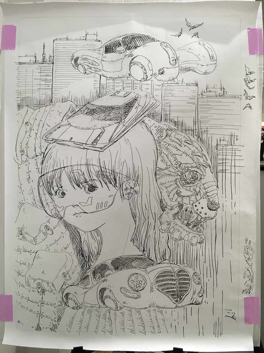 地元のTV番組が毎週、ショッピングモールの一角で取材撮影をしていまして、この日はショッピングモールのセールがあり、定位置ではできなくなった異動先が僕の展覧会をしているギャラリーだったのです。当然のようにNOとは言えないので渋々笑顔で答えて10枚展示しているのに3枚の前で店を広げ出したらか割と泣きそうだったのですが、格好を気にしなければ絵を外して床に置けば展示はできるので早めに申し出て展示し直しました。で、その取材撮影が結局日中ずっとだったので、モヤモヤしながら夕方になり、早くバラしてくれないと帰れないなあ、片付けまだかな。と待っている時間が一時間半くらいだったので迷いつつも結局描いたのがこれです。