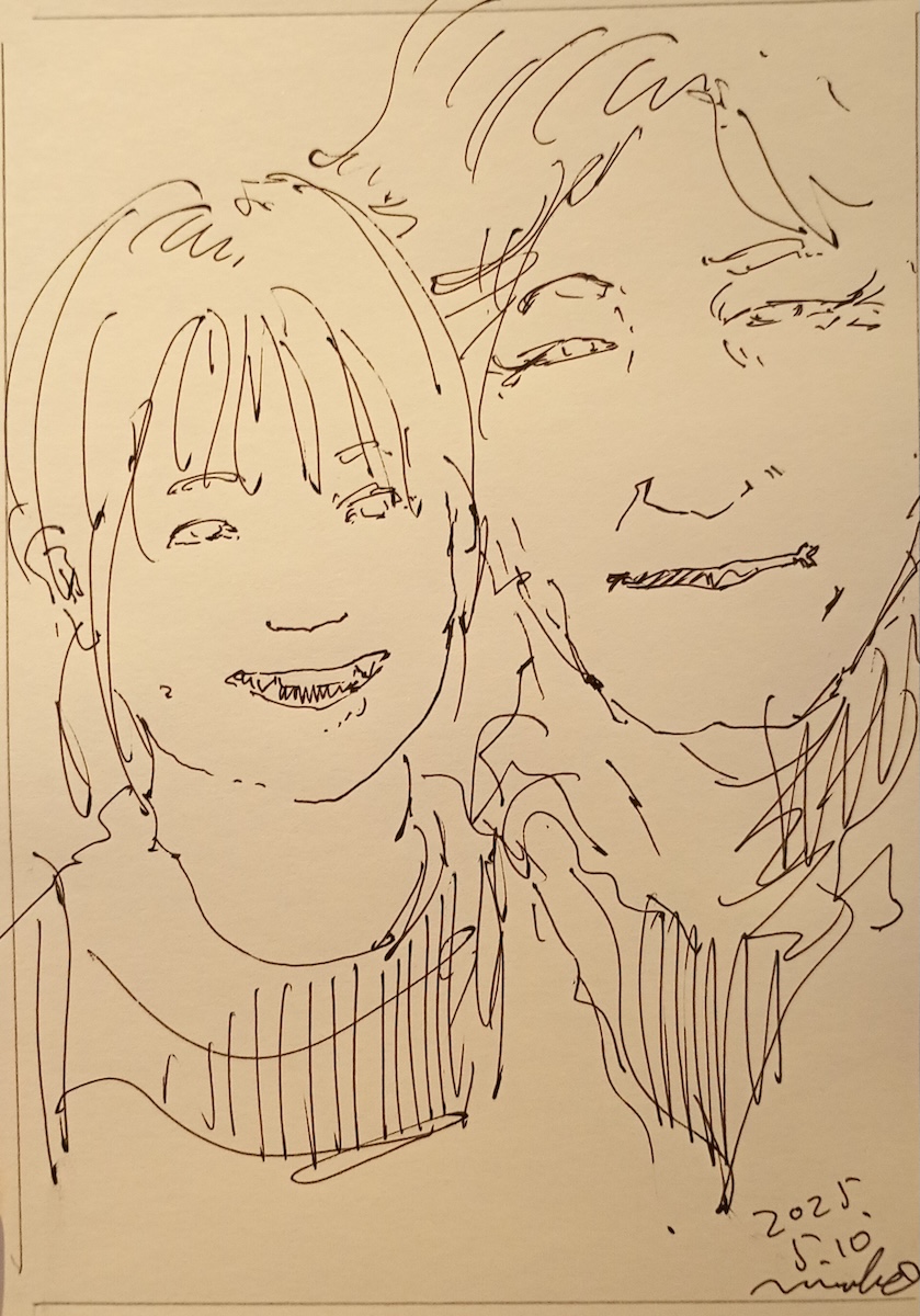 展覧会をお願いしている喫茶店のお店の方からスタートで、久しぶりのツーショット似顔絵。児童センターで親子や兄弟の二人組を描いていたので描くのは問題ないが、今回は一人を想定したサイズだったので緊張した。二人のバランスが難しいです。