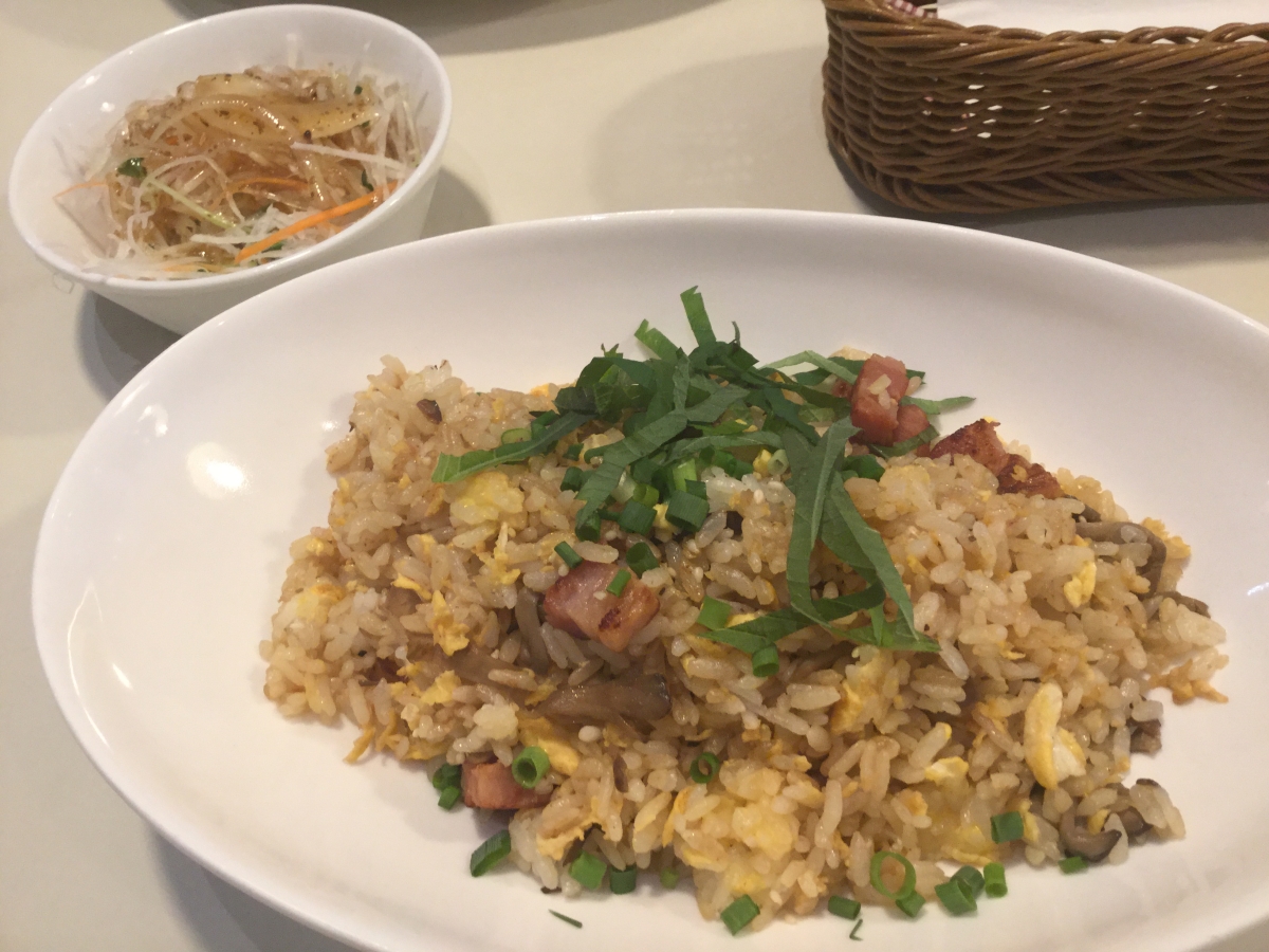 ベーコンときのこのピラフ。ベーコンの存在感がはっきりしていてピラフと一緒に食べるときの触感が楽しめる。そうそう、大根のサラダもシャキシャキして美味しい。空腹を満たすことももちろんだけど、お昼の仕事への切り替えにもちょうどよい。