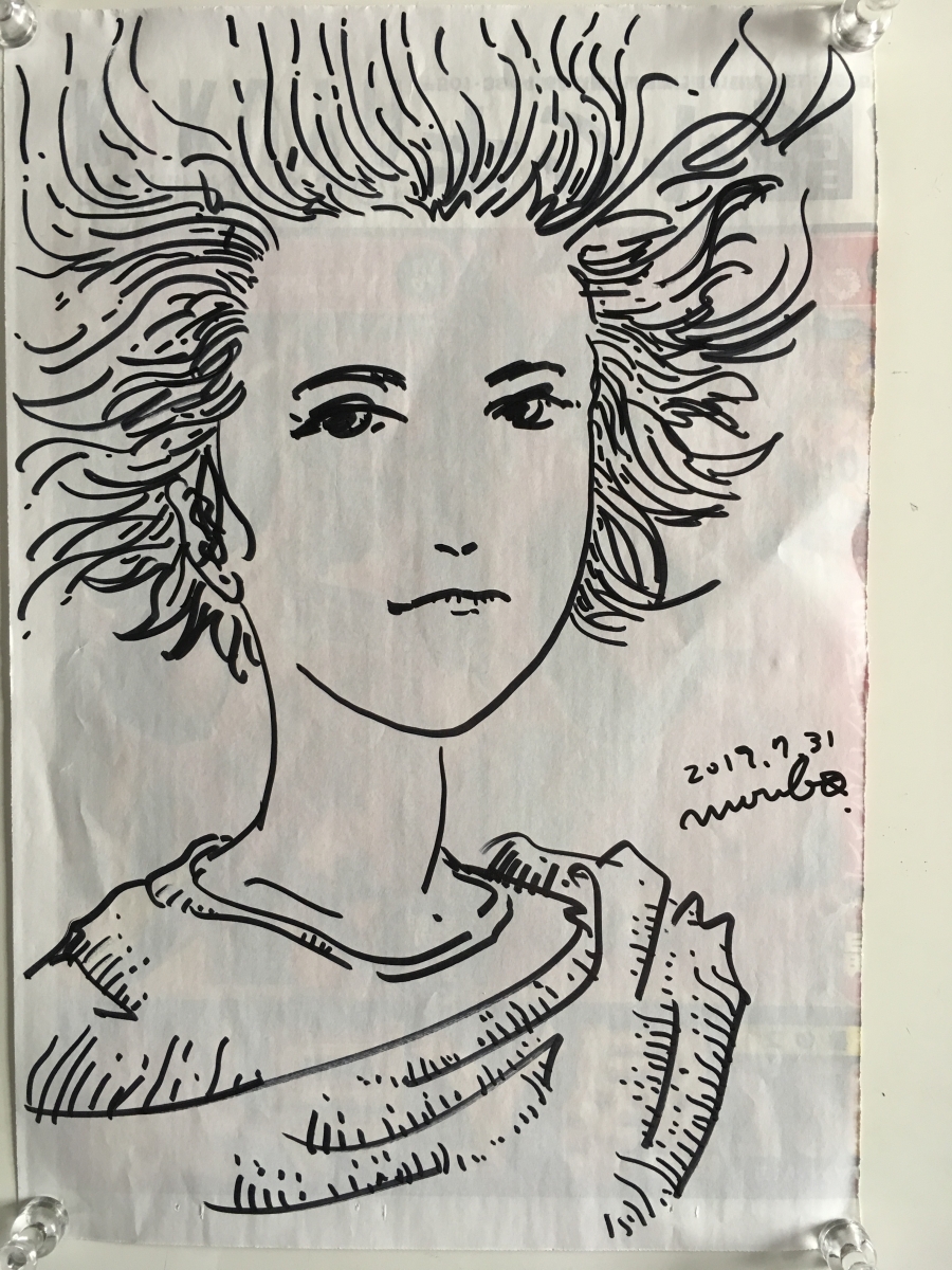 Picture lunch time drowing 190731 投稿者: murbo 投稿日: 2019/07/312019/07/31 久しぶりにランチタイムドローイング。何かを食べているところに限定すると同じような感じになるので、食べることに特定しないことにした。気楽に描くはずなのに全く気楽でない。相変わらずのチラシの裏。もちろんわざとです。表面が滑るので描きづらいです。 紙に油性ペン。 関連記事: lunch time drowing 190724 lunch time drowing 190814 lunch time drowing 190819