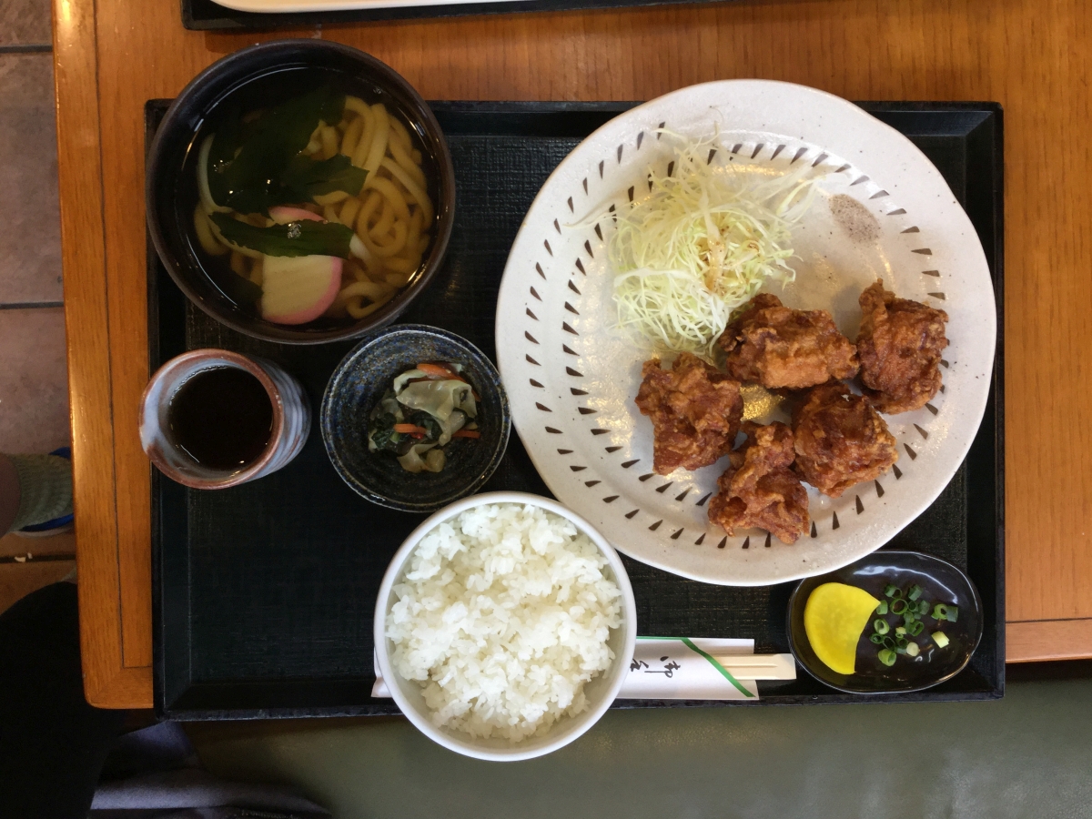昨日は唐揚げ定食。セットメニューは味噌汁が続いたのでうどんを選んだ。