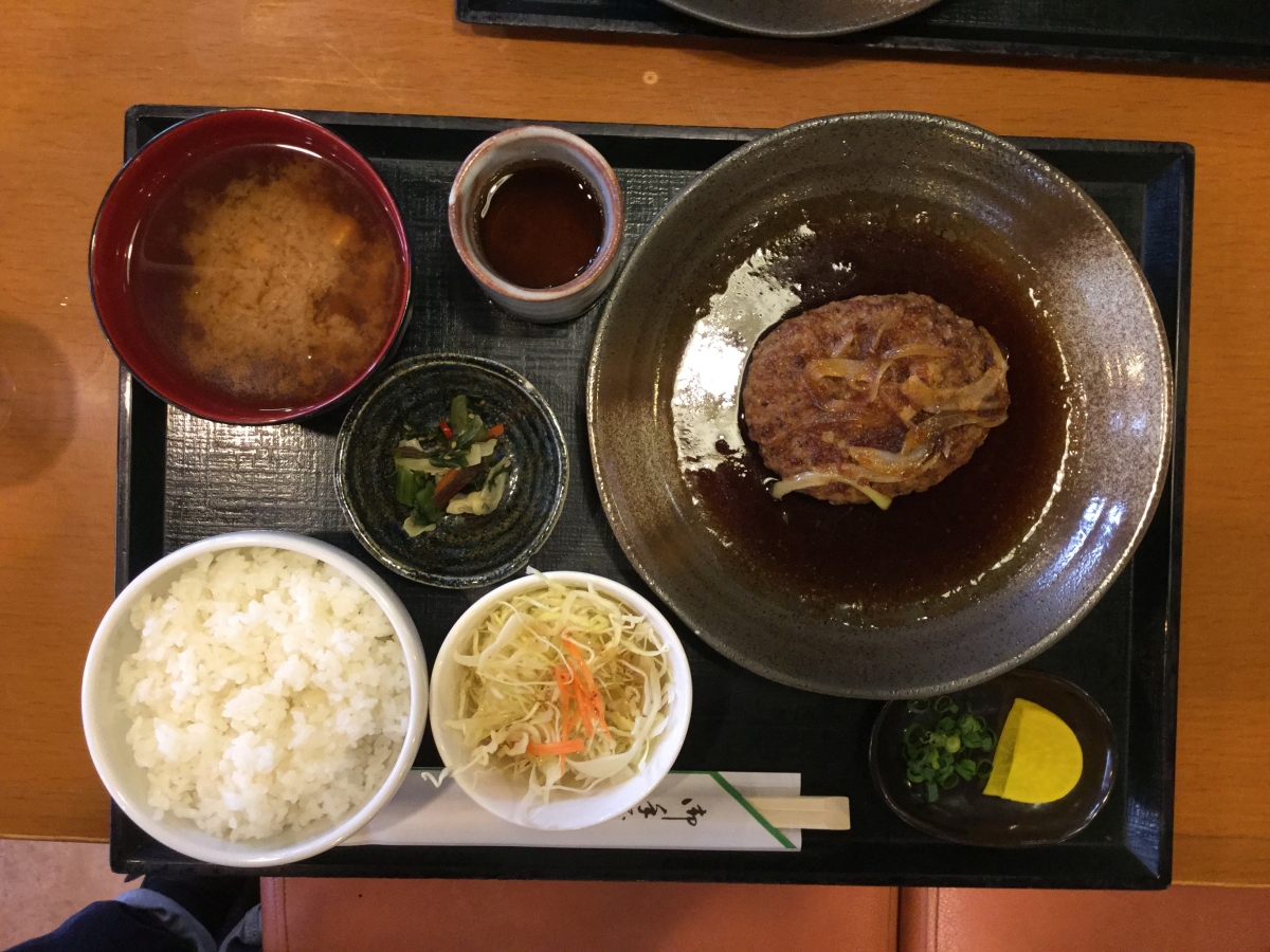 何だったっけ?和風ハンバーグ定食。あとで確認したら和風ジンジャーバーグ定食。ちょっとハンバーグに慣れてきているが、それにしても箸が曲がるくらい弾力が強いのは毎度だ。