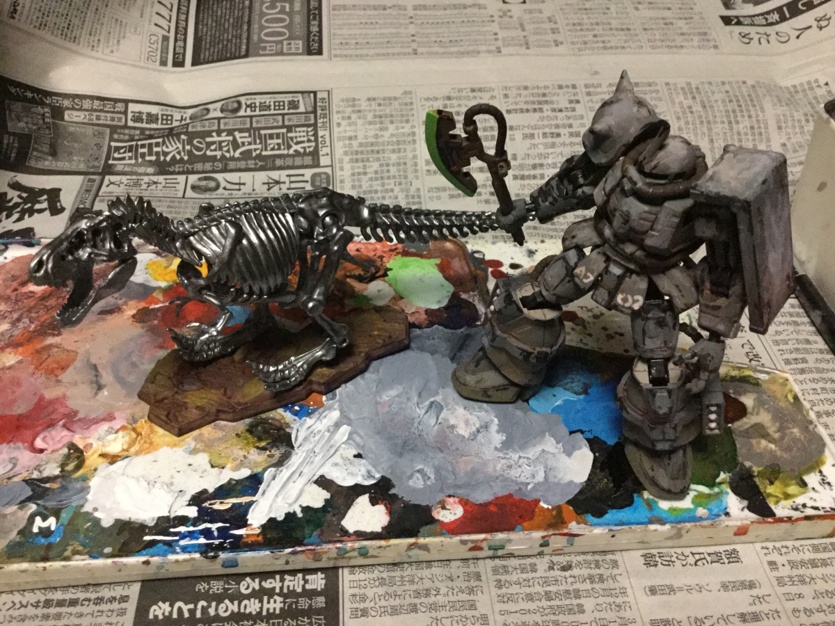 塗装中。ティラノサウルスはアクリル塗料のシルバーで塗って鉛筆を削った時に出た削りカスをこすりつけ、更に乾拭きで磨きました。思ったのとはちょっと違った質感だが、かなり金属的な質感に出来た。