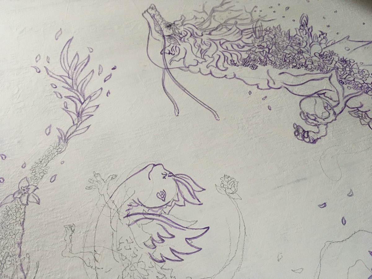 キャンバスに描きます。これまでは鉛筆で下書きをしてから色をつけていましたが、先に輪郭を描くことにしました。この輪郭は多少活かしますが彩色がある程度できたら違う色で再度輪郭を描きます。