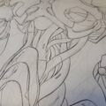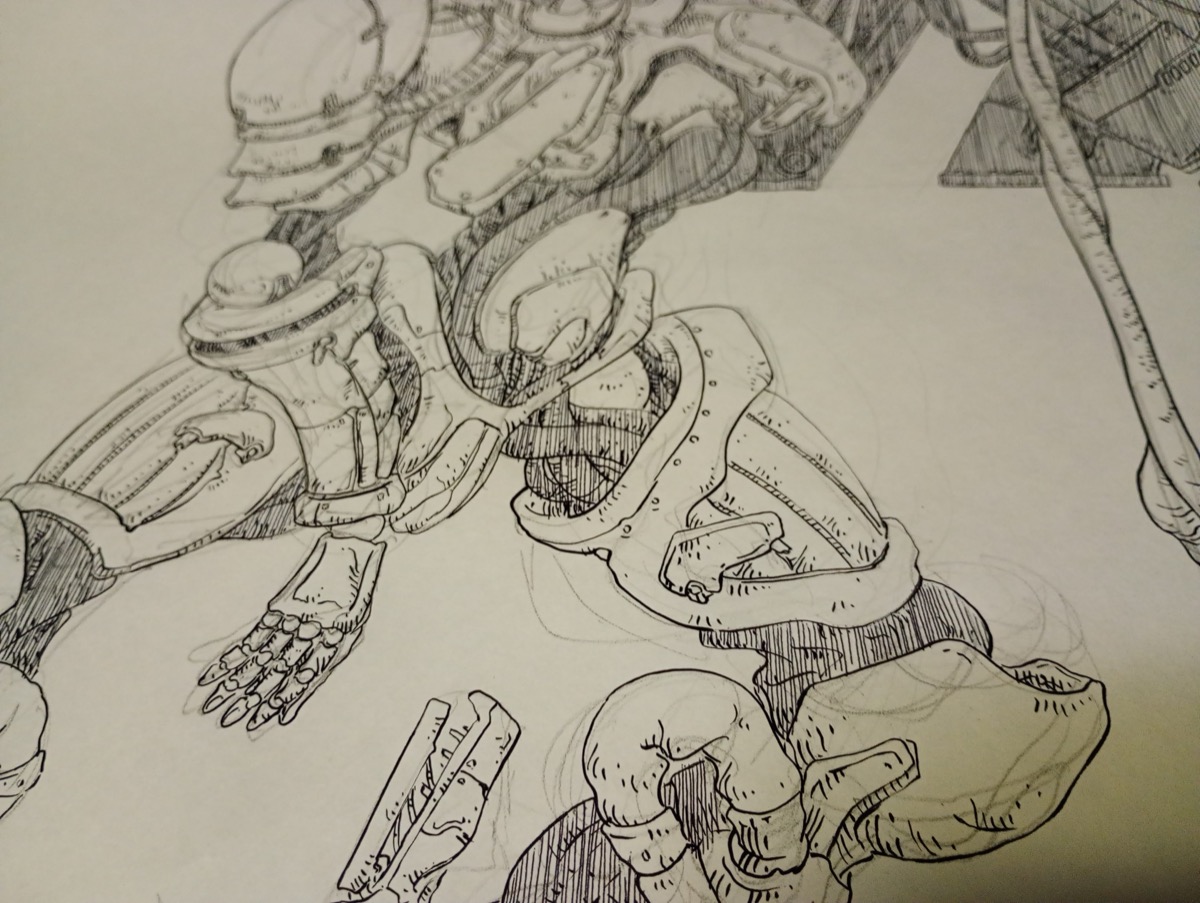 グレーを作っています。ここだけ油性ボールペンで縦の線をいっぱい描いてグレーのように見せています。ある程度法則を作ってグレーにしています。油性ボールペンは昔ながらの安いアレです。これで良いのではなく、これが良いのです。はっきり黒くならないことや、かすれがタッチになることなどが使う理由です。やたらインクだまりができるので頻繁にペン先を拭かないといけないことや、ペン自体がとても軽いので長時間描いていると辛い点です。前者はどうにもならないのでこまめに拭き取っています。後者は使いやすいボディに入れ替えています。