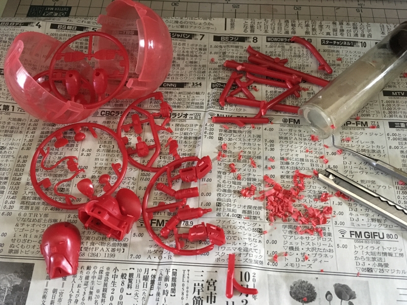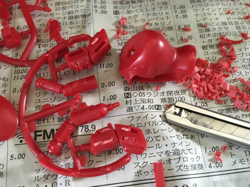 改造の前に下準備がいるのだった。脚に肉抜きがあるので、そこを埋める。かなり深いので付属と言うかくっついていたランナーを削って埋めている。隙間は空くので接着剤とかパテなどで埋める。このランナーは1/35ガチャーネンシリーズ特有の円形になったランナーではなく、フィギュア王誌についてきた段ボール箱の中に入っているための円形ランナーのそのまた外のランナーだ。意味が分からないと思うが、本来の商品にそのまた外についてランナーという事だ。