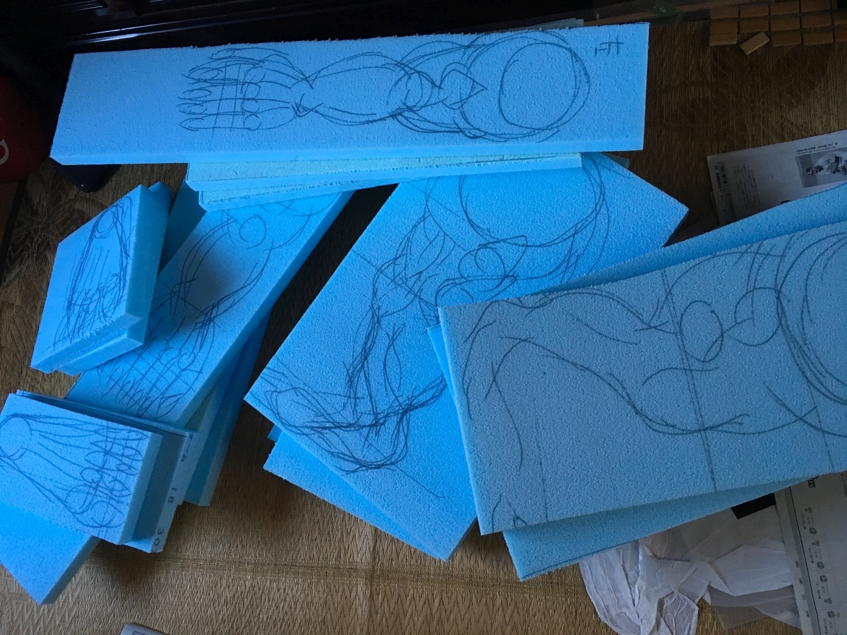 これで180x90x1cmのスタイロフォームもを三枚と少々消費。三枚では足りなかったなあ。腕と脚は伸ばした状態の当たりを描いて、後で曲げてポーズを作ります。