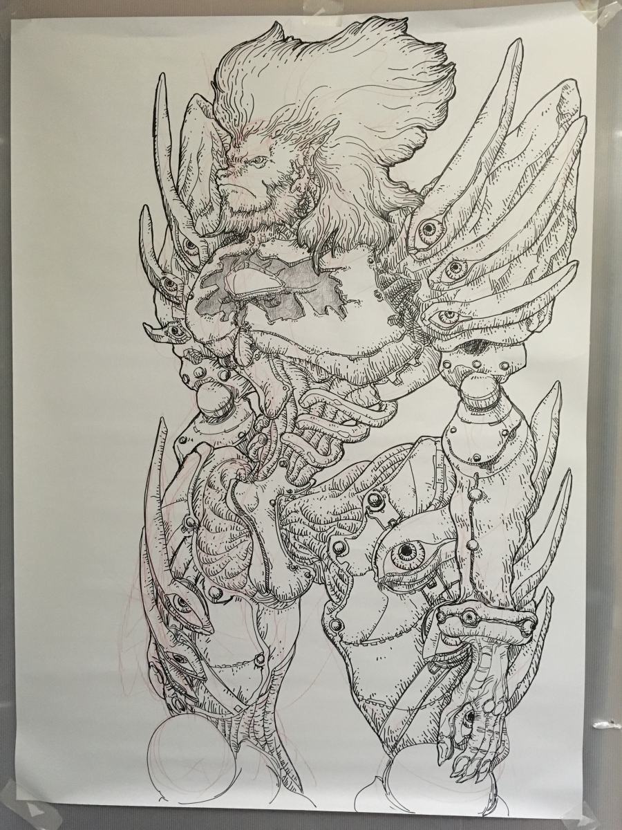 これはロボットなのか、超人なのか、描いている本人もわからないし、どちらでもいいし、もっとライオン的な骨格の顔でも良かったかもしれないが、演出上、人の顔に近くないと困るのでこうしている。