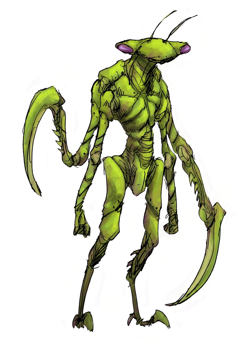 カマキリを記憶スケッチ。カマキリの怪人は何体も描いてしまっている。もっと雑に描きたい。