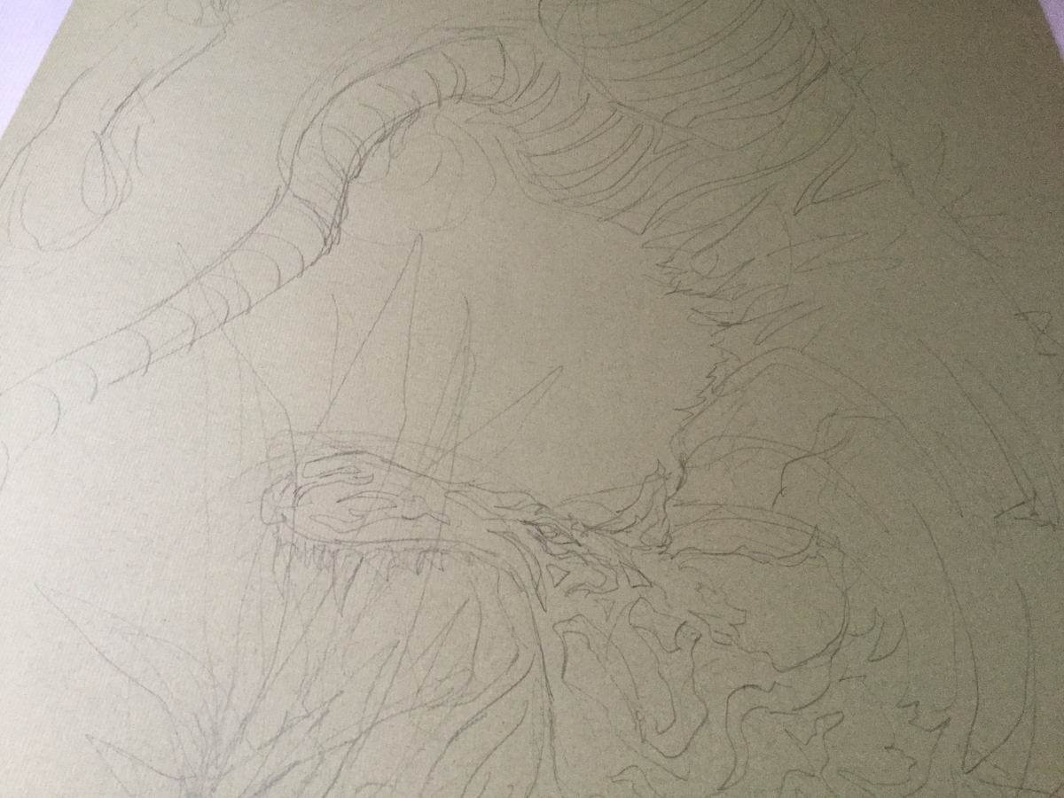 途中でボールペンのインクが無くなったので、油性ボールペンに持ち替えています。油性ボールペンを勧めるyoutube番組などあったので良くないとは思いながらお試し。色が真っ黒ではないことがとても気になる。描いているとインクがだまになるのでこまめにふき取るのは常識のようにやっているので気にならない。それと描いたところがテカる。入りと抜きにタッチを出すには油性が良いと思う。しかし、僕はそれは全く気にしていなくてむしろタッチが無い方が良くて、まぁどうしたものか。