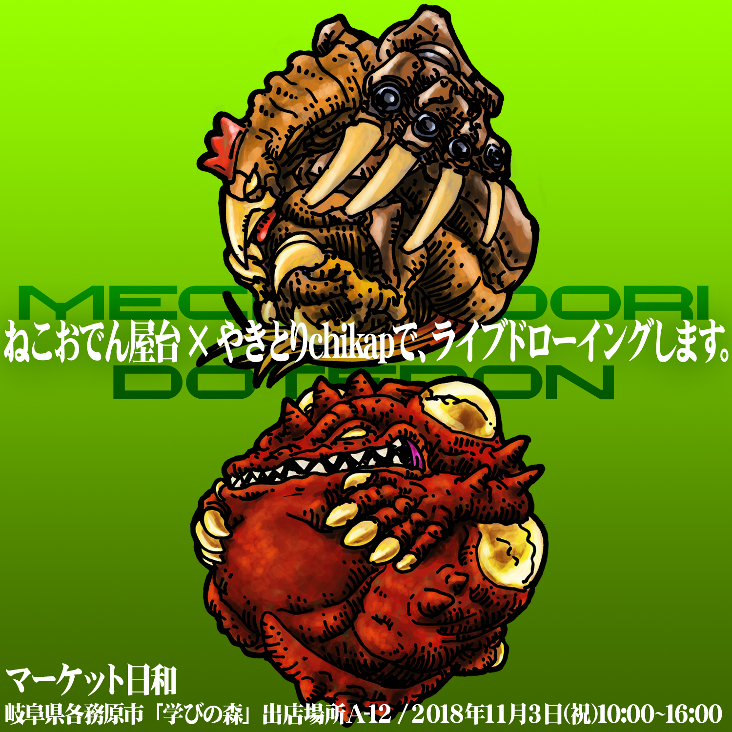 11/3の文化の日(もしくは漫画とゴジラの日)に岐阜県各務原市の学びの森という場所で開催のマーケット日和にねこおでん屋台Xやきとりchikapで焼き鳥とドテ丼を売ります。設営場所はA-12です。売るのも作るのもねこおでん屋台とchikapの方々で、僕は店の前で怪獣を描きます。ここでは毎度お馴染みのドテドンです。これな。