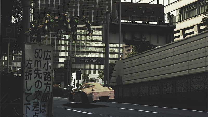 奥に配置する要素から合成します。ビルに映り込んだGk1。位置関係はLightWaveで合わせてあるので単純に読み込んでOK。