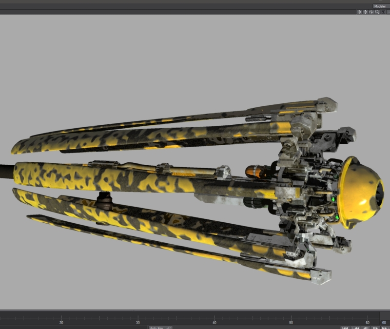 こうやって見ると自分でも何が何だかわかりません。半球状になっているのが先端のレーザーガンです。骨組みだけの傘みたいになっていて、折りたたまれた部分を展開して飛行装置としても機能する設定です。