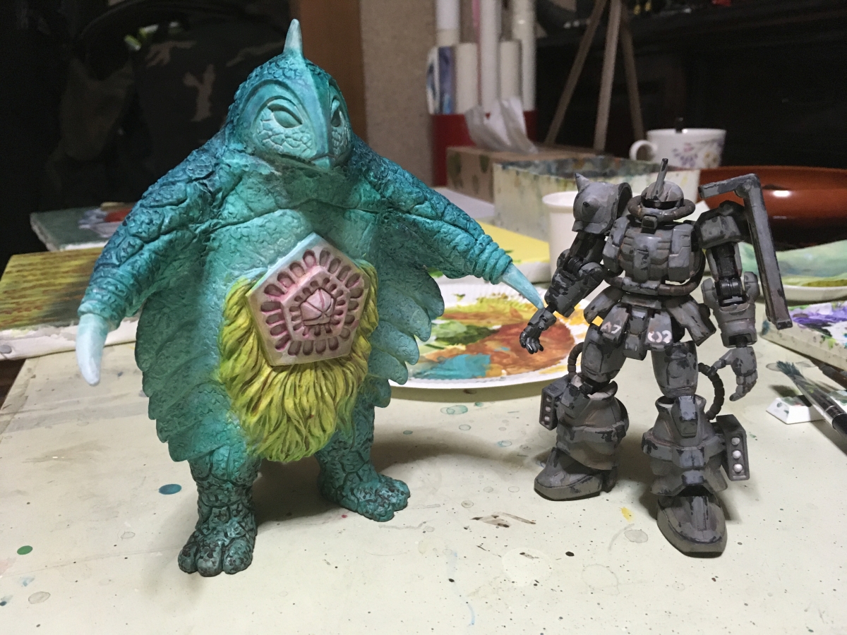 まあぼんの制作の後でなにげにベムスターにペイント。絵の具の残りを消化できればと思ったが、そこそこ塗れた。ここまでセリアで買っためちゃくちゃ硬い平筆でざっくり塗ったのだけど、細かいことを気にしないほうが雰囲気でるのかな。