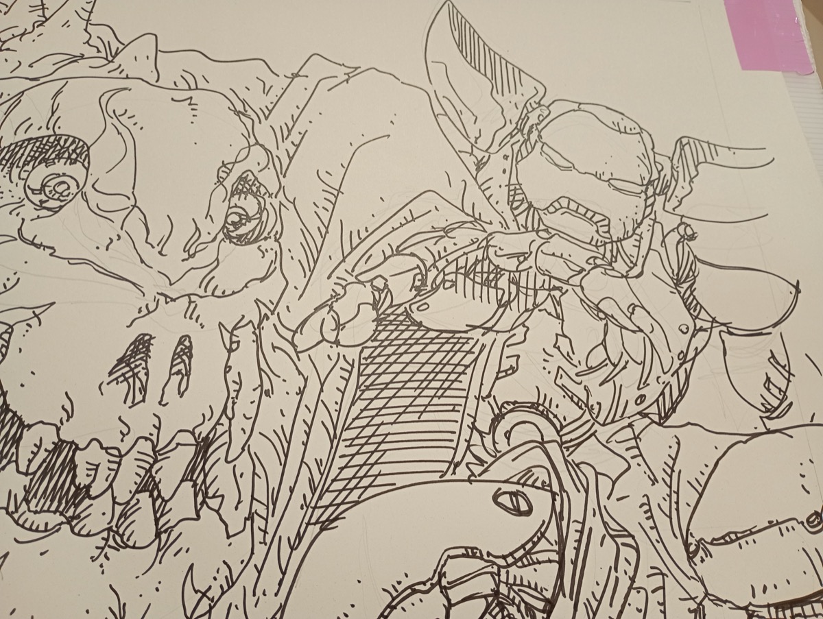 毎度、おおよそのあたりはとっています。複雑に重なるところとか、デザインが決まっていない部分などは細かく下書きを描く時もあります。下書きを描く理由は迷っているからです。理由がなければ描かなくていいです。