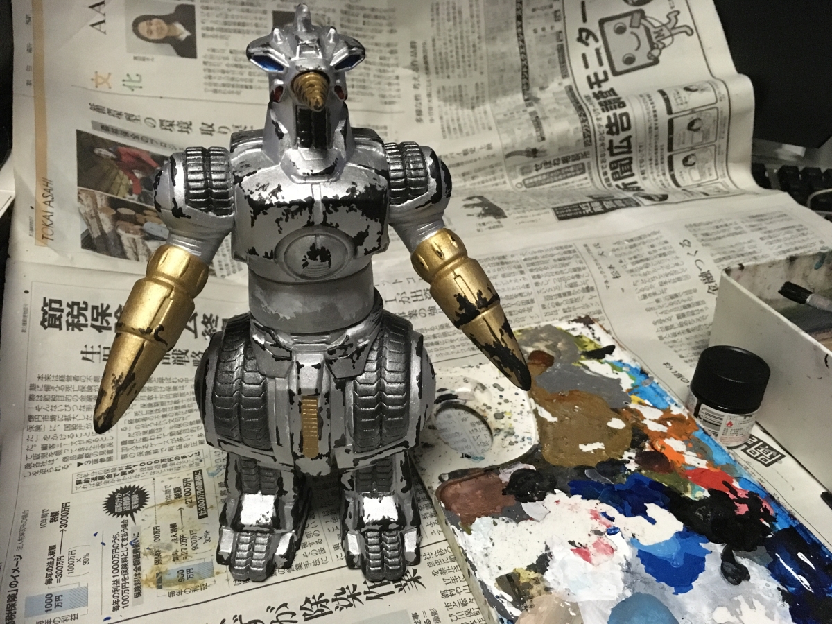 プラモ painting Moguera part5. 投稿者: murbo 投稿日: 2020/07/312020/07/31 Gフォースが建造したモゲラも盛大に塗料が剥げたり削られたりしていることにして塗っている。こんなにぼろぼろになることはないと思うが、建築や解体現場にあるユンボなどを見ていると錆が塗装してあるのかと思うくらいに錆びているし、可動部分に触っているところは塗装するのが無意味なくらいに剥げている。一応運転手の利き手を意識して剥げているように書き込んでいる。胴長にみえるのは上半身をただ載せているだけなので、本来下半身にはまっている部分も出ているからだ。というのが昨日の作業。 Readers who viewed this page, also viewed:MOGERA(バンダイ製ソフビフィギュア) 関連記事: painting Moguera part3. モゲラ(バンダイ製ソフトビニールフィギュア) MOGERA(バンダイ製ソフビフィギュア)