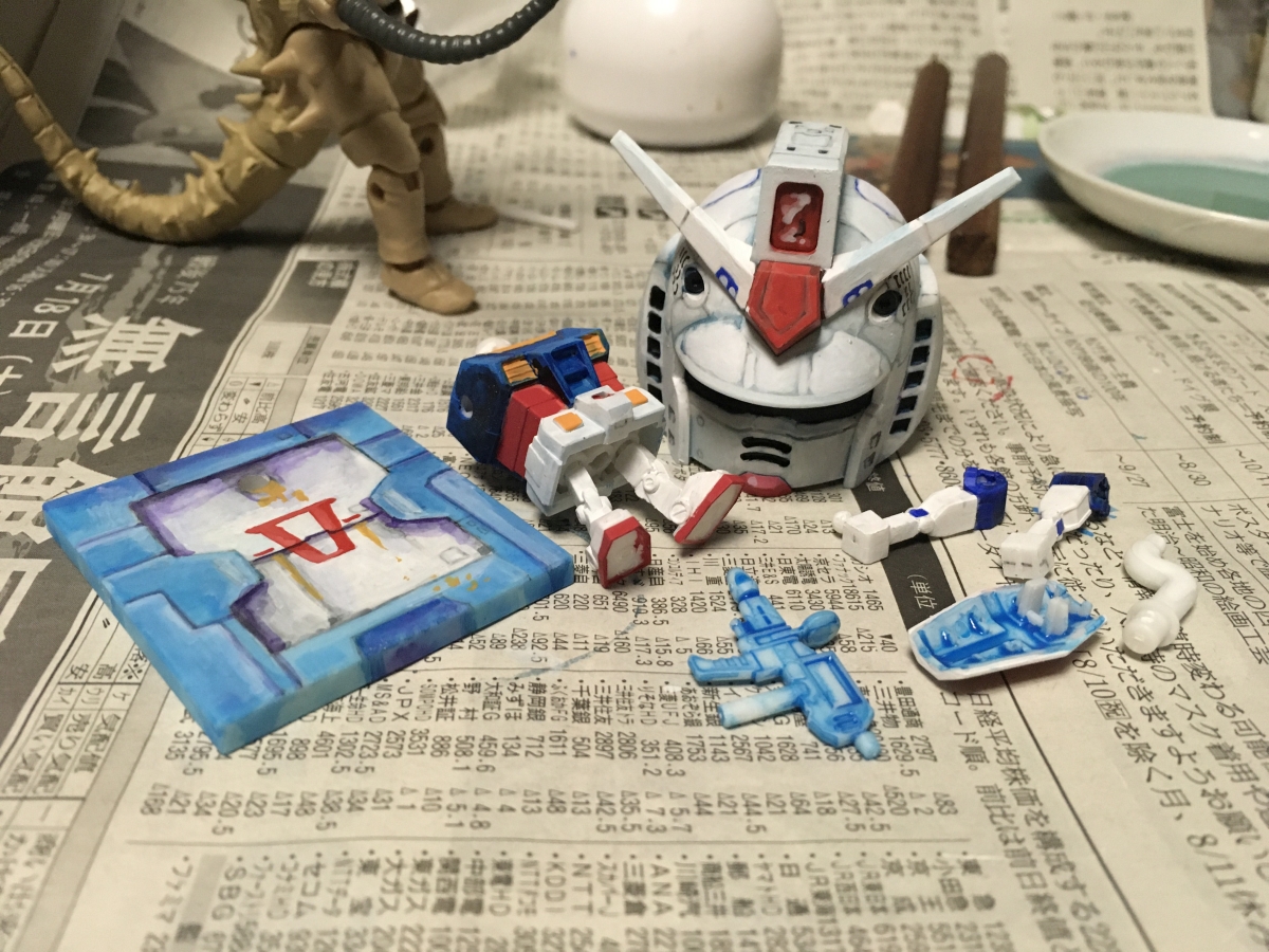 塗装はアクリル絵の具だ。最近はターナーなどのメーカー自体がプラモデルの塗装にアクリルガッシュを推している。プラモデル以外に本来の用途の紙などへの絵を描く画材としてもアクリル「ガッシュ」を勧められることが多いが、僕はどちらも使った上で普通のアクリル絵の具を使っている。アクリル絵具は艶があり、ガッシュは艶消しといわれる。画材屋さんでも最近言われた。しかし、僕はアクリル絵の具でも艶は消えている。透明絵の具で艶消しにできるのです。やり方は水の量をやや多めにし、おすましのようなゆるさで塗るのです。筆の置き方で絵具が水溜りのようになることもあるので乾燥する前にうまいこと溜まった箇所を調整する必要があります。
