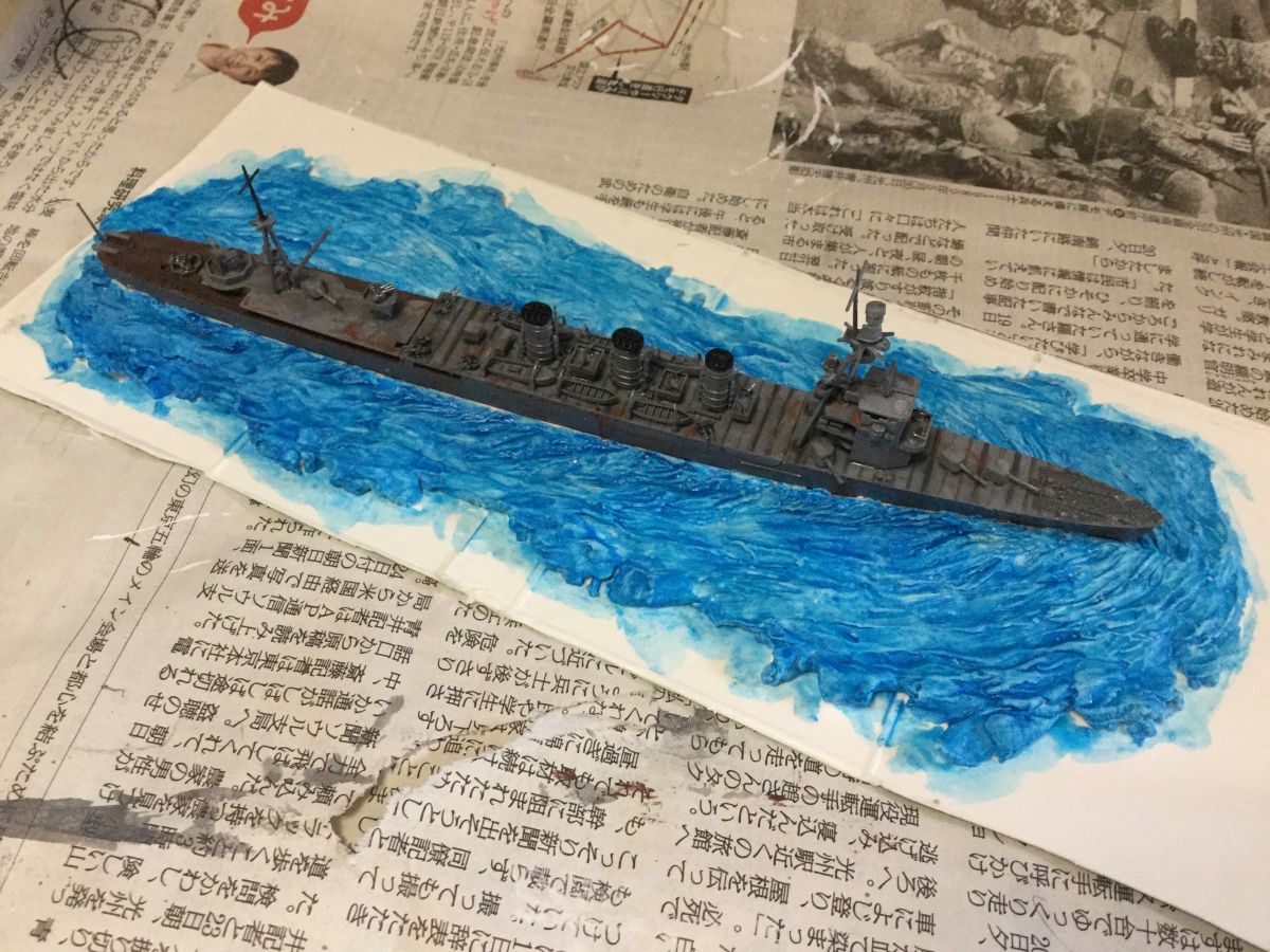プラモ 軽巡長良のベースの塗装2 投稿者: murbo 投稿日: 2020/07/062020/07/06 紙粘土を伸ばして波っぽく形を作って長良を乗せます。そもそも平面でなかったり、乾燥で伸縮して破れたりして隙間のできたところを粘土で埋め、粘土では埋めづらいところはモデリングペーストで埋めます。 色はアクリル絵の具で青色を重ねています。長良を乗せてしまったのでドライヤーは使えないのでこのまま自然乾燥です。 Readers who viewed this page, also viewed:軽巡長良のベースの塗装3 関連記事: 軽巡長良のベース1 軽巡長良のベース2 軽巡長良のベースの塗装3