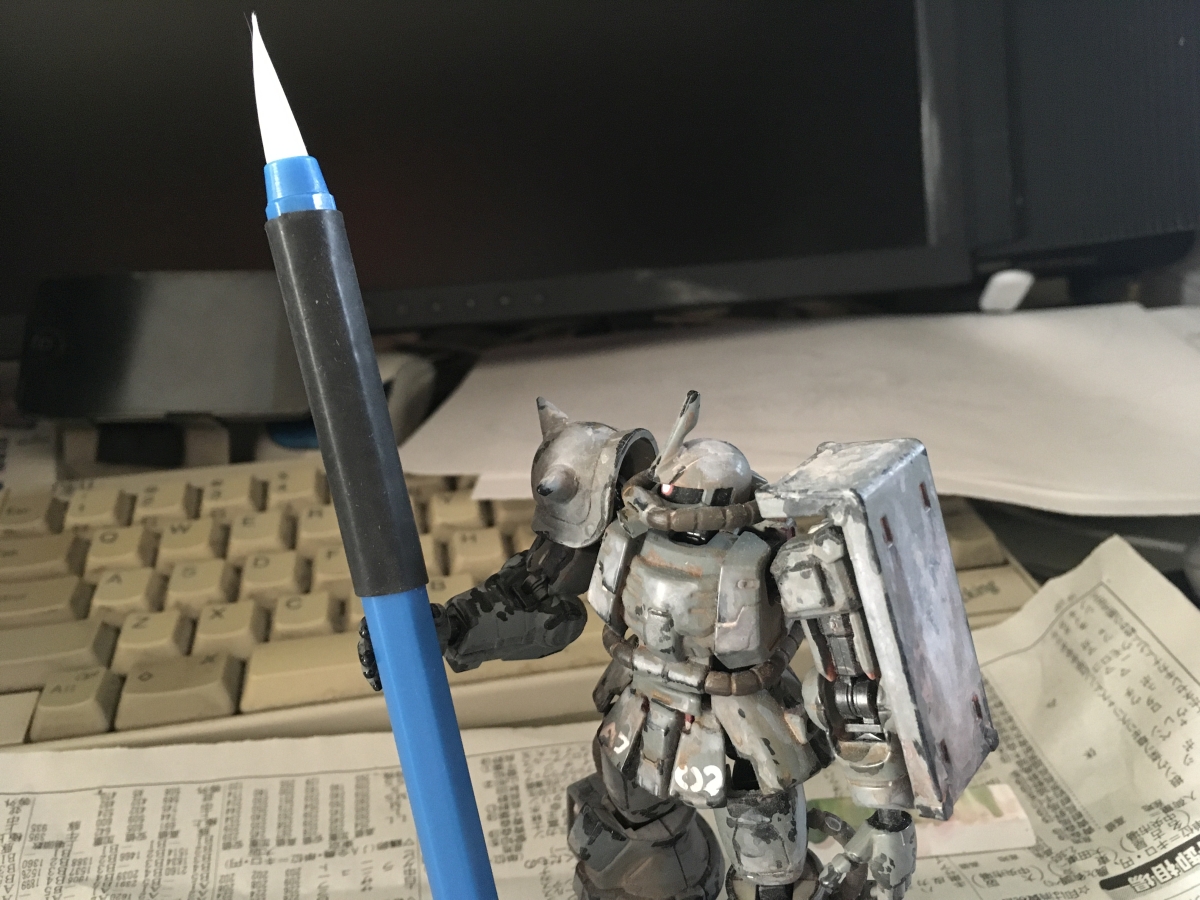 仕事道具 みずがきふでで描く。 投稿者: murbo 投稿日: 2021/09/292021/09/29 ダイソーに売ってました、水で描くと濡れたところが墨っぽい感じになるシート専用の水筆。なんでこれかといいますと、筆の素材がPET樹脂なのです。壁画を描いている塗料のペンキとの相性はどんなものかと思ってお試しです。軸はABSで、中空なのでスカスカの軽さです。断面が六角なのは良いとしても持ちづらさがあると思ったので、ラバーシートを巻きました。実践投入は壁画制作再開の折に。 関連記事: 壁画のための筆。 PREPPY再び使っている。など。 DaVinci Resolveでセーフティエリアを表示する。