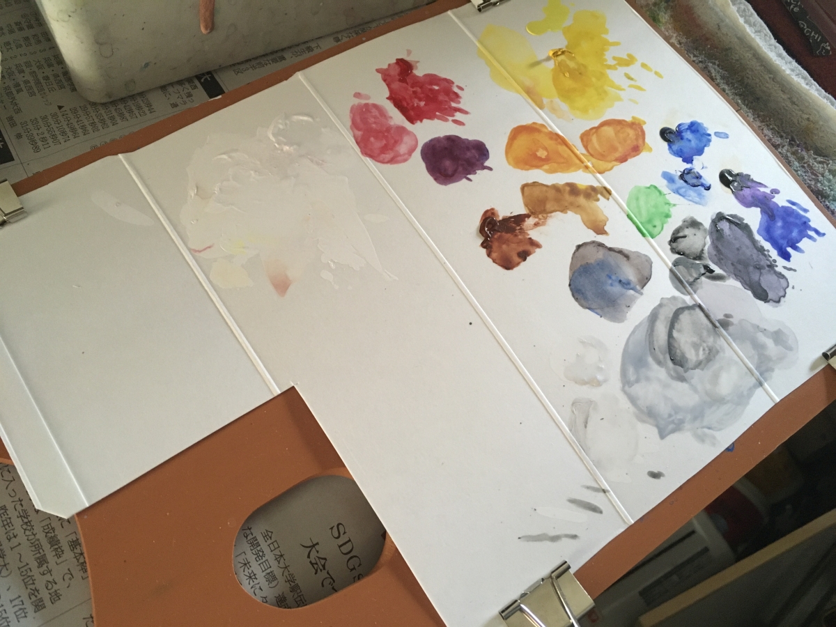 使い勝手については実はあまりよくない。以前も書いたけどセンターに二つ折りのために固定するピンが出ていて、牛乳パックを乗せると外に向かって湾曲するんだよね。写真のように少なめに絵具を出したり、現状をわかって慎重に使えば垂れることはないです。牛乳パックは使い捨てにできるので乾燥したら剥がしたりなどの掃除をしなくてよいのは気楽ではあるが、見た目は格好悪いよね。誰かに見せることなどはほぼ無いのでいいんだろうけど、自分の気分の問題は残る。