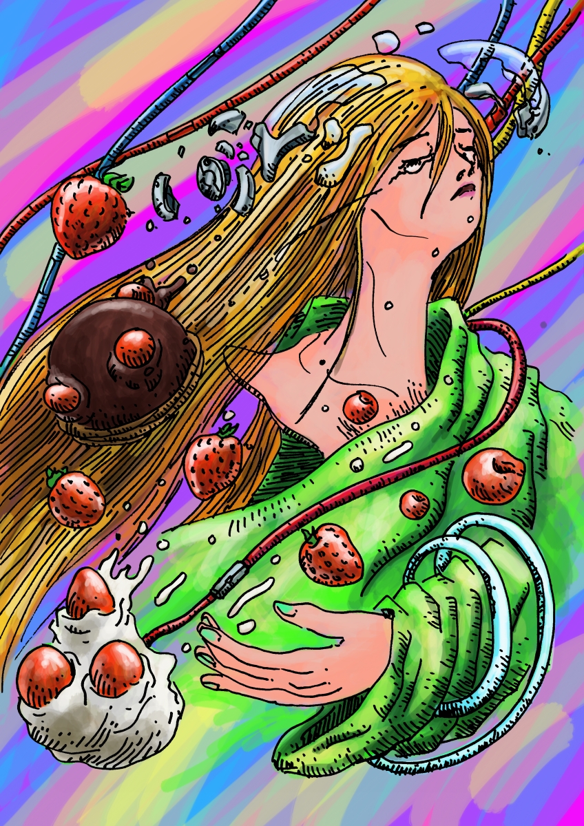Picture・panic cake PANIC CAKE 05 投稿者: murbo 投稿日: 2018/08/222019/02/26 ちょっとペースが落ちてきたので気合入れてやろう。しかしそろそろペンがかすれてきた。太いペンで描くことも練習なのでめんどくさいなあ。 芯ホルダーに赤い芯を入れてあたりを描いて油性ペンで描いています。 油性ペンのドローイングにProcreate(iOSアプリ)で彩色。 関連記事: PANIC CAKE 8 PANIC CAKE 14 PANIC CAKE 35