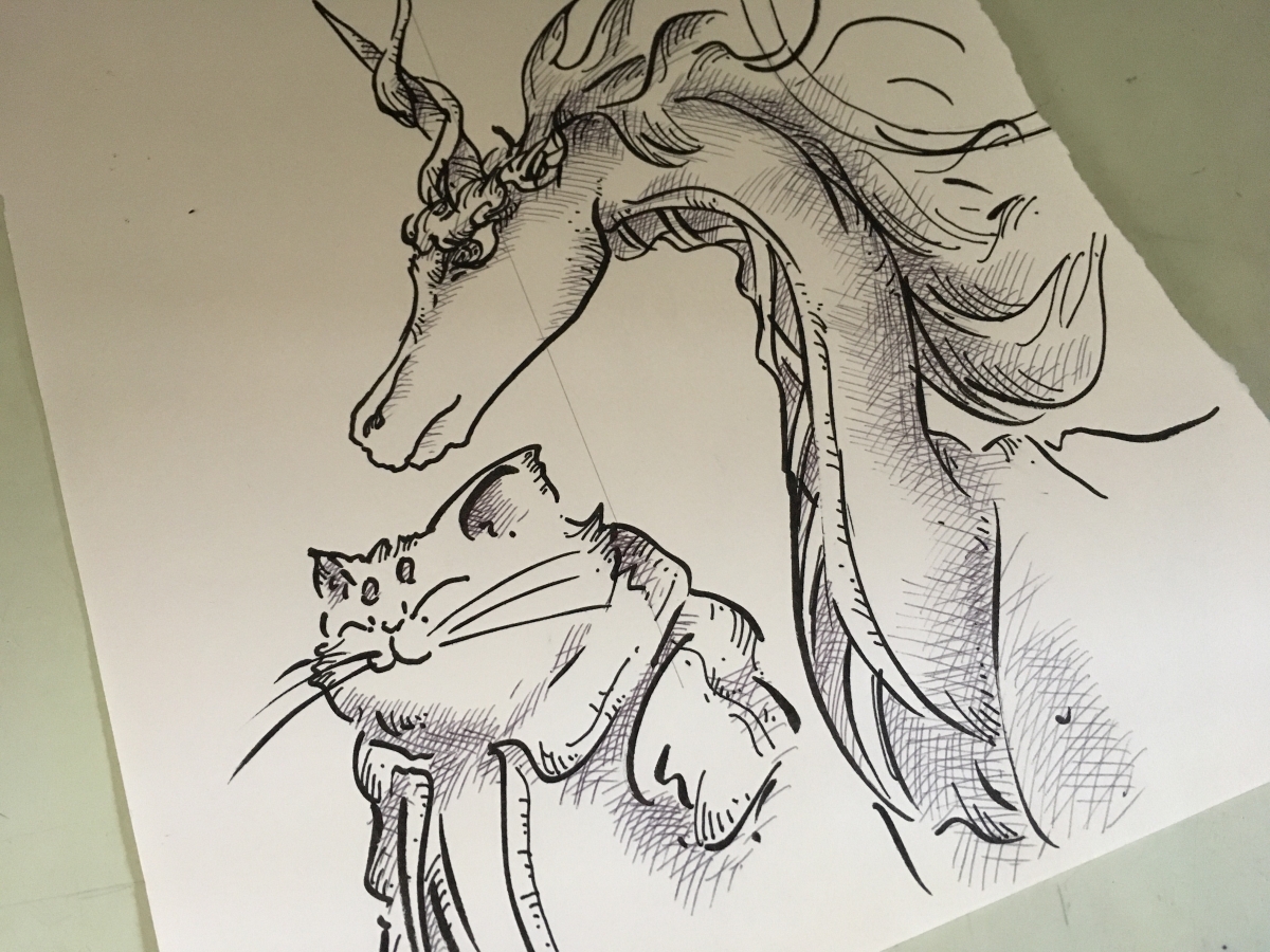 気になるのは色で、真っ黒じゃないのだよね。スキャンしてしまえば調整できるから気にしなくていいかもしれない。しかし、展示するにはあからさまなボールペンインクと墨汁の色の違いと要らないテカりも気になる。つけペンで描ければ問題は解消されるものの、線が太いんだよ。それとこちらも意外とインク(墨汁)をつける量で太さに揺らぎがあるので、まだ油性ボールペンがましに見える。しばらくは油性ボールペンに登場してもらうけど、まだ完全の余地ありだなあ。