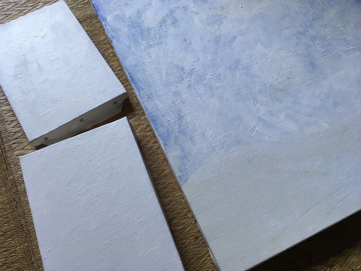 大きいのがまあぼんで描く用で小さい二点が自分用。大きい方は途中で放置してしまったので下地の前にジェッソで塗りつぶす必要があるのです。写真では透けて見えますが、コツコツ塗りでなんとナック見えなくなっています。完全に乾燥したら紙やすりで削ってできるだけ表面を円滑にします。今までやっていなかった方法なのは、小さな大きさでもある程度描き込みたいからと、キャンバスの目が自分には荒く感じるのでなんとかしたかったのです。