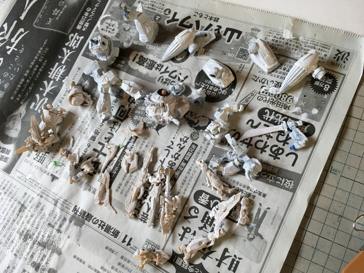 プラモ 次の塗装の下塗り。 投稿者: murbo 投稿日: 2023/05/172023/05/17 次に塗るものたちの下塗り。食玩アーティファクトのZガンダム、グフフライトタイプ。塩ビ製フィギュアのグフ、アッグ、アレックスチョバムアーマー装備です。真っ白になるまで塗った方がいいのはわかっているけど、そろそろ本塗りしようか。結局重ねて塗るし。 関連記事: とりあえず分ける。 アーティファクト、ガンダムとドムの塗装。3 アーティファクト、ガンダムとドムの塗装。4