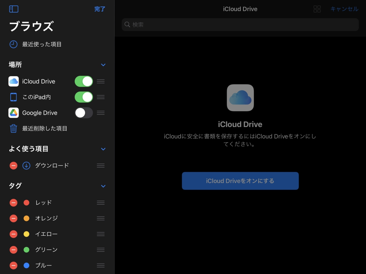 なにかといいますと、Procreateからgoogleドライブにあるデータを読みたいがGoogleドライブが見えないのです。頻繁に読み書きしているのにどういうことだろうか。