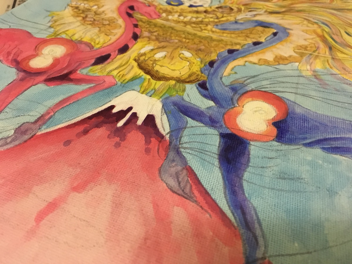 本来水彩の方法ですが、色は薄く薄く重ねています。ここで言う薄くとは、水などで極力薄めた絵の具という意味です。シャドウははっきりつけたほうが早めに完成できる気がします。