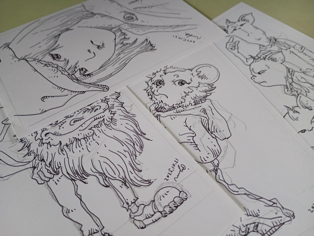 日記 25年10月21日の制作。 投稿者: murbo 投稿日: 2025/10/282025/10/28 こればかり描いているわけではないが、ルーティーン感覚で描いています。写真のL版サイズでこれまでスケッチで描いていた絵を描きなおしていて、万年筆でコツコツ描いてそろそろ100枚溜まる頃です。来年開催予定の展覧会で販売予定。予定の予定です。買われるかはわからないです。特にテーマは決めず、これから描く絵の初期デザインとか、これまで描いた絵のリメイクもあります。没になったりした絵もありますね。没というのは仕事などで使わなかったデザインのキャラクターなどです。 関連記事: 仮面ライダーかもしれない人たち P.K.Aが気になる。 生ごみのお知らせ用の絵