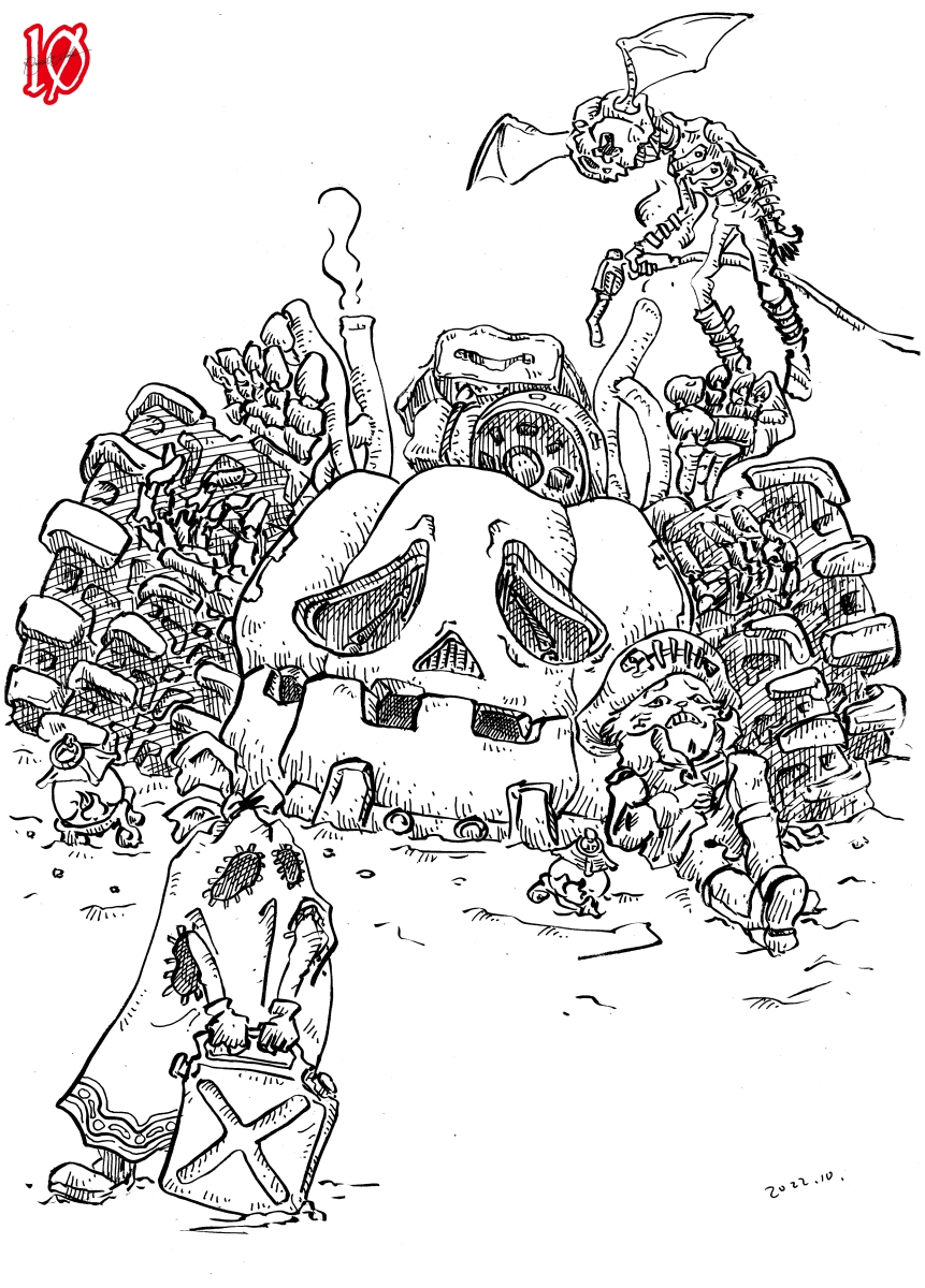 Project October 2022 Project October 2022 day14. 投稿者: murbo 投稿日: 2022/10/142022/10/26 inktober 2022の14日目。EMPTYはからっぽ。パンプキンバギーがガス欠でぐったりしている様と猫(の名前はまだない)が一緒に空腹になっている。パンプーキッド(飛んでるやつ)と布かぶってるやつ(名前はまだない)が燃料を調達してきた。猫の腹はへったままだ。 紙に筆とボールペンでドローイング。 関連記事: Project October 2022 day28. Project October 2022 day29. Project October 2022 day7.