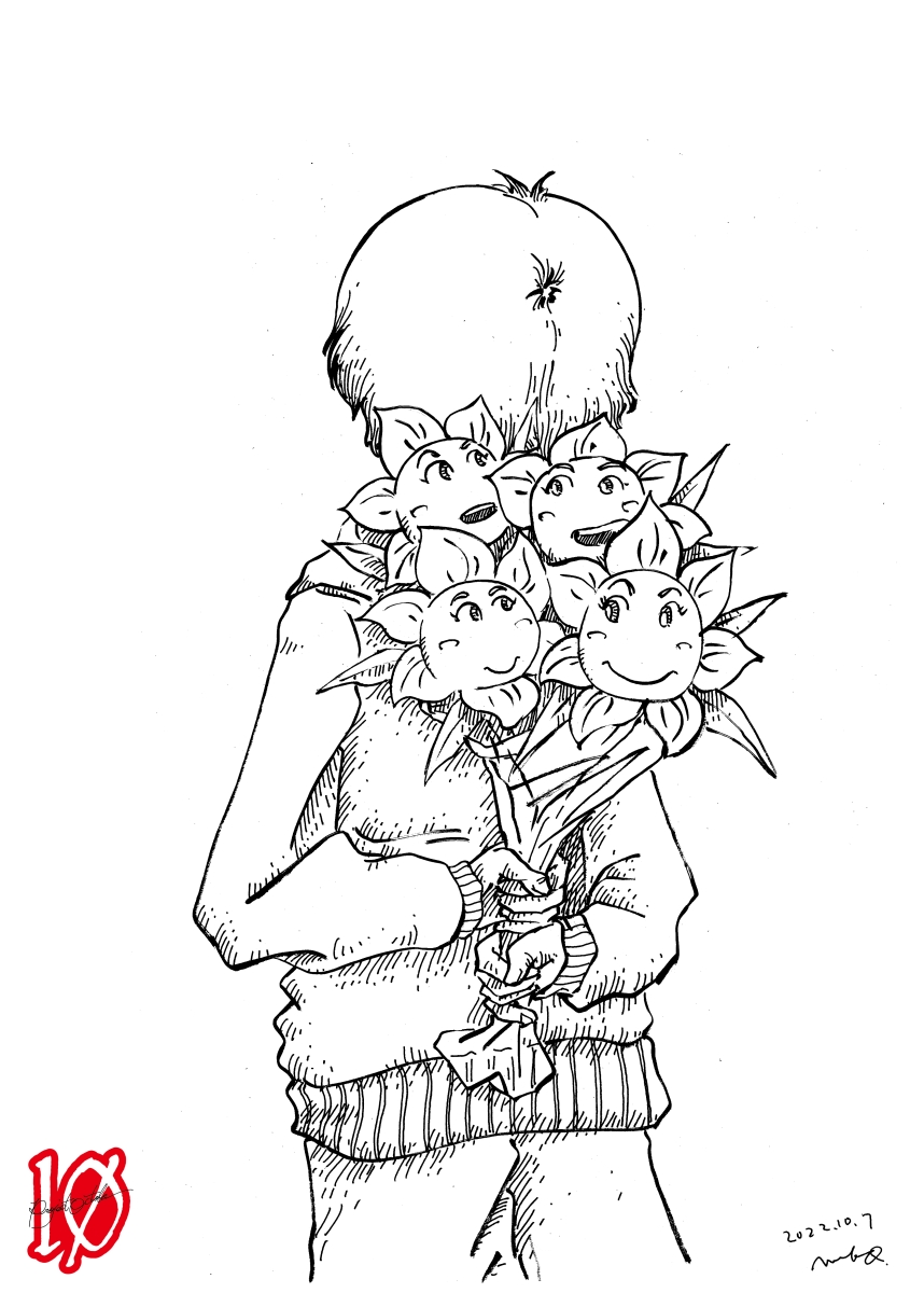 Project October 2022 Project October 2022 day6. 投稿者: murbo 投稿日: 2022/10/082022/10/26 六日目はBOUQUET、花束。花束を主役にしたかったので視線が鼻に集まるように考えた。 最初に描いた花束。あんまり自分らしくないとかドラマとか作りにくいかなとか思ってもう一枚描きました。 紙に筆とボールペンでドローイング。 関連記事: Project October 2022 day4. Project October 2022 day8. Project October 2022 day18.