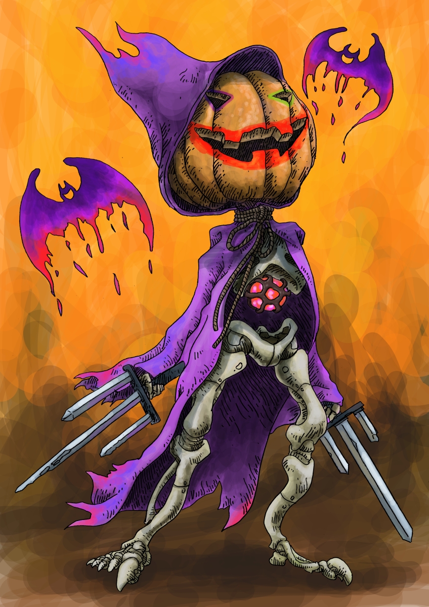 Picture pumpking 投稿者: murbo 投稿日: 2019/10/312022/10/13 鼻を描くのを忘れた。inktoberのお題同様に要素を全部まとめています。コウモリはちぎった紙が魔力で飛んでいる設定。お菓子とイタズラのトレードは無視され、かぼちゃ頭がボロボロの刀を振り回して殺しに来る。 紙に鉛筆(0.9mmシャープ)のドローイングにProcreateで彩色。 関連記事: パンプーキッド211118a パンプーキッド211118 jackbat 230906