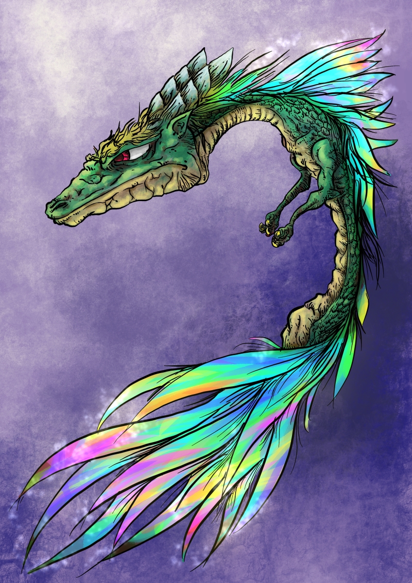 Procreateのジャスチャーを説明するために描いた。しかし、尻尾が派手なドラゴンもいたらいいやないのと思ったのも理由の一つ。本当は対になるドラゴンを描こうとしてシルエットだけ描いて放置していた。顔を三角形にしたかった。