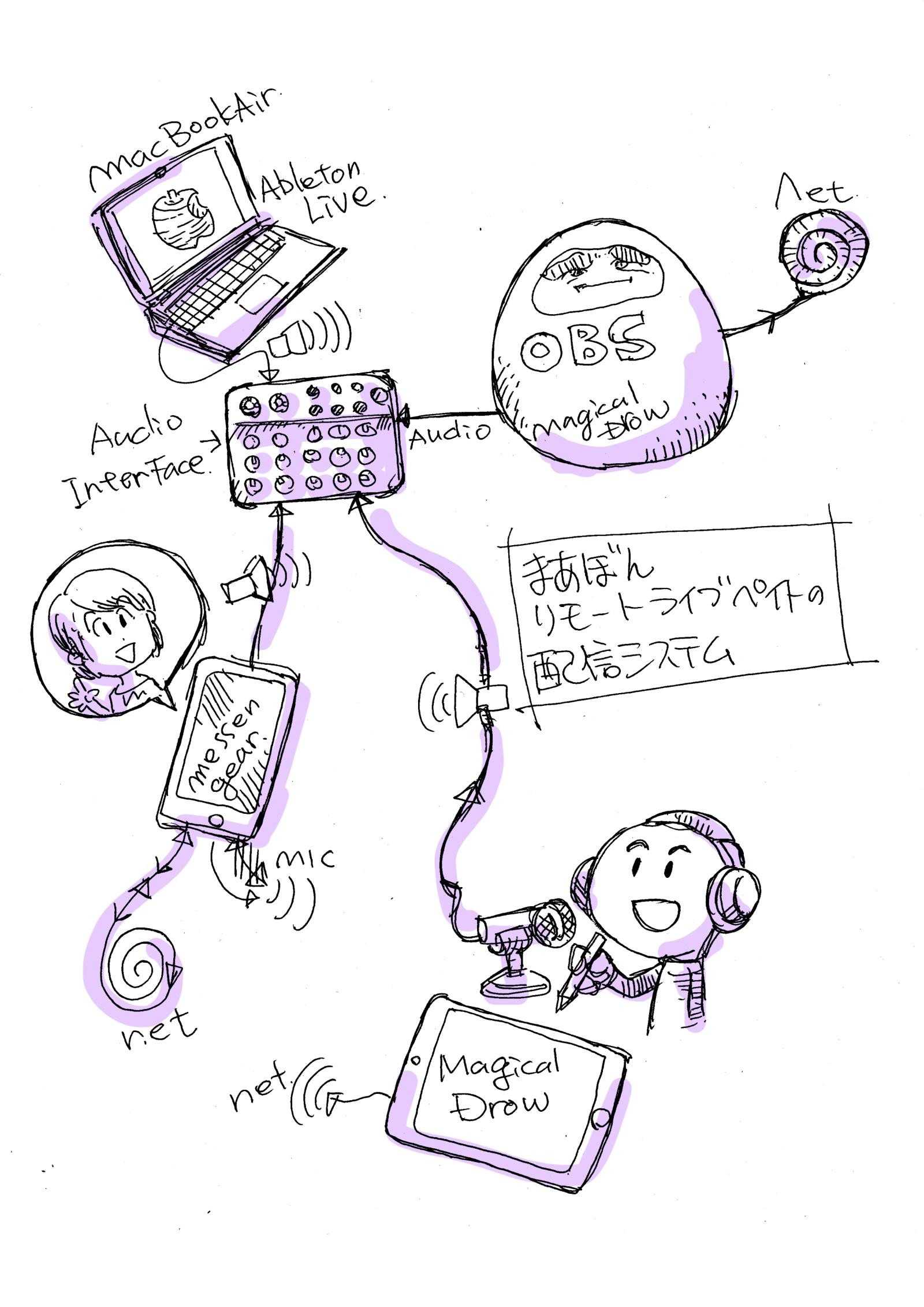 今回からBGMをつけた。これも自作している。大したことはなく、ループトラックをKORG Gadget2で作ってAbleton Liveで再生している。これ専用にMac Book Airを当てている。Mac Book Airを使っているのはたまたまこれがあったからだ。こうやってそれぞれ単一の仕事を割り当てないと挙動が不安定になることが多いからだ。トラブル回避のために再起動などしなければならないときも他の作業に影響しなくてよいのだが、場所ばっかり取るし、実際パソコンを必要台数用意できるか問題がある。多分今が限界じゃないかな。