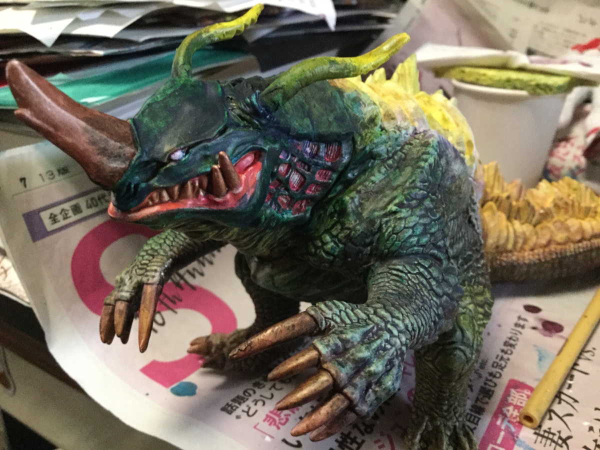 プラモ ネロンガのリペイント。 投稿者: murbo 投稿日: 2021/06/192021/06/19 昨日の続きでネロンガのリペイント。 体の先端は青を塗り重ねることにしました。しっぱは先端ですが、赤っぽくしています。トカゲみたいに再生した尻尾をみたいに紫っぽくしようとしていたので二背びれが意外と物々しく最後までディティールがあるので黄色へグラデーションがやりやすい色にしました。まだまだ続きます。 関連記事: 2021年6月18日の制作。 ガボラとベムスターと裁人とネロンガのリペイント。 ネロンガとゴジラ vs destroya 220909