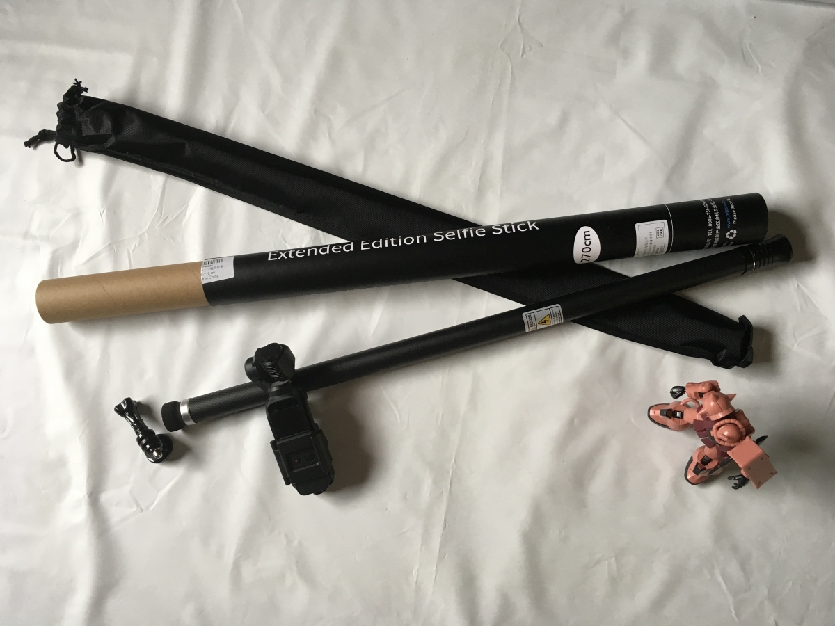 で、自撮り棒。本来は360度カメラのinsta360 one Xに使うものらしいが、OSMO POCKETでもだいたい同じように使えるのでいいのですよ。