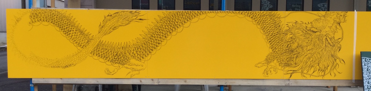16時頃になると急に足元から冷え込んできます。これは堪える。それでも書き込みまして、とりあえず鱗の描きました。暗がりでも周囲の明かりで描けるんじゃないかとか無理を考えていましたら、とても描ける明るさではなかったので、ここでタイムアップ。結局三日目に持ち越すことになりました。明日がんばろうと勝手に思っていたら明日、12月29日はまあぼんで制作している麒麟の制作日だったので明後日の30日に描きます。