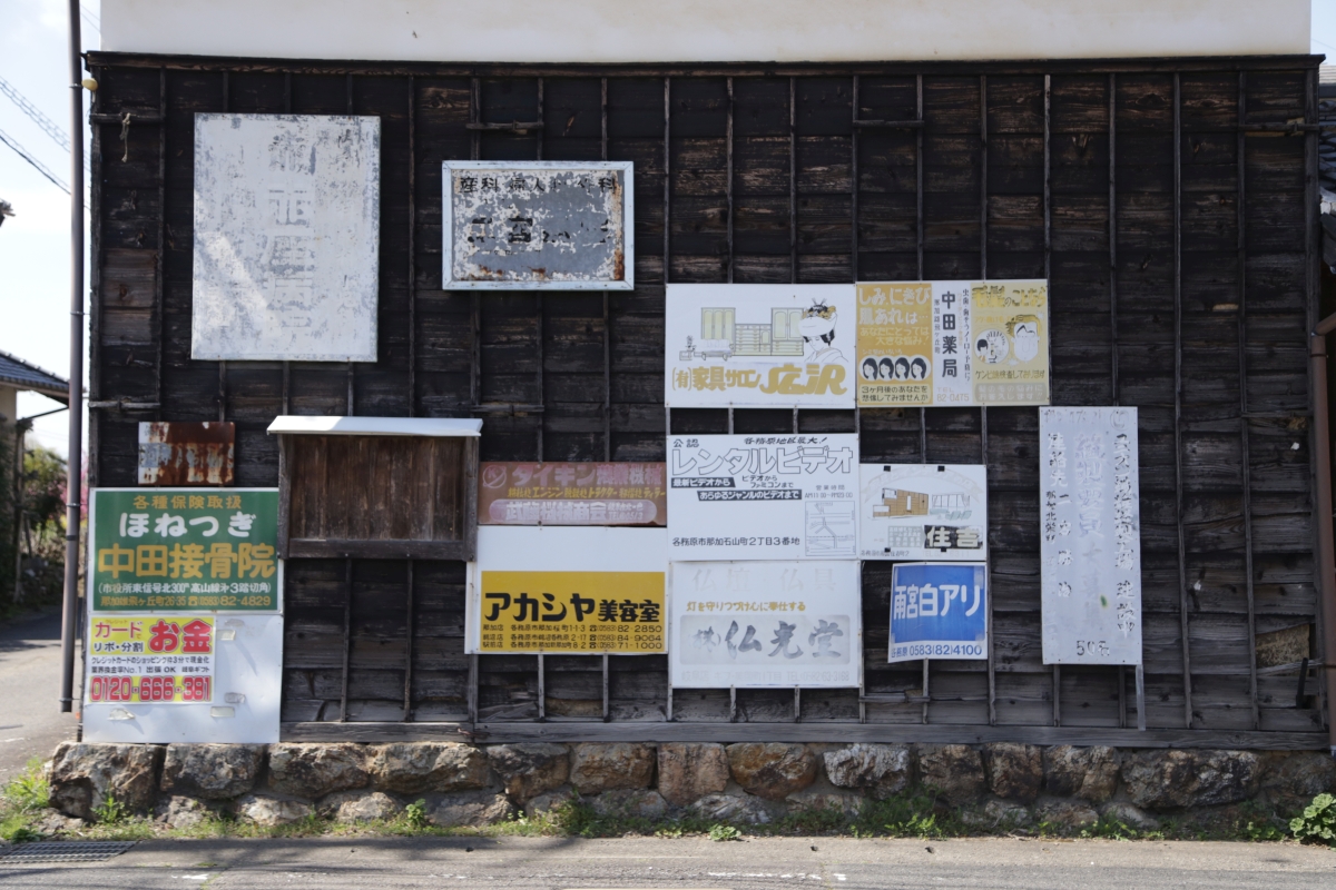 前から知っていてたまに撮っていた壁。看板が色褪せている。すべて古い昭和の高度成長期の看板かというとそうではなく、色が残っているのなどは掲示して十年以内のような看板である。中央にある看板はレンタルビデオの看板でファミコンカセットなどもレンタルしていたのか販売してたのか扱っていた模様。ビデオも映像という意味ではなくメディアとしてもビデオテープのことだ。
