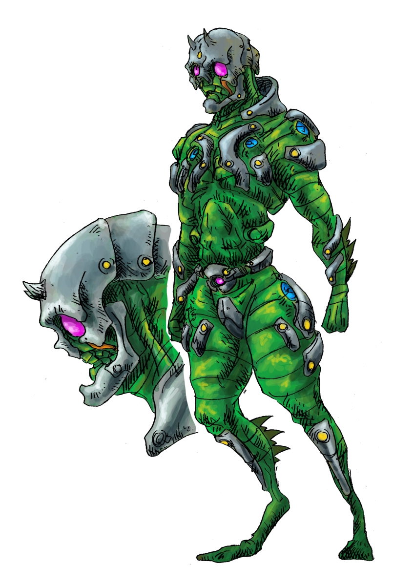 レッドヴァイパーとともに戦うバッタ怪人。まぁ、あれなんだが、あれにならないようにと、怪人とそうじゃないのの設定上の違いを盛り込みたいのでちょっと考える。各所にある金属部分が怪人の体調を安定させるとかなんとかで、もっと金属パーツを増やそうかな。ベルトみたいなものは人間態への変身を高速化するとか、副作用を軽減するとか。徐々に変身機能が失われているとか。