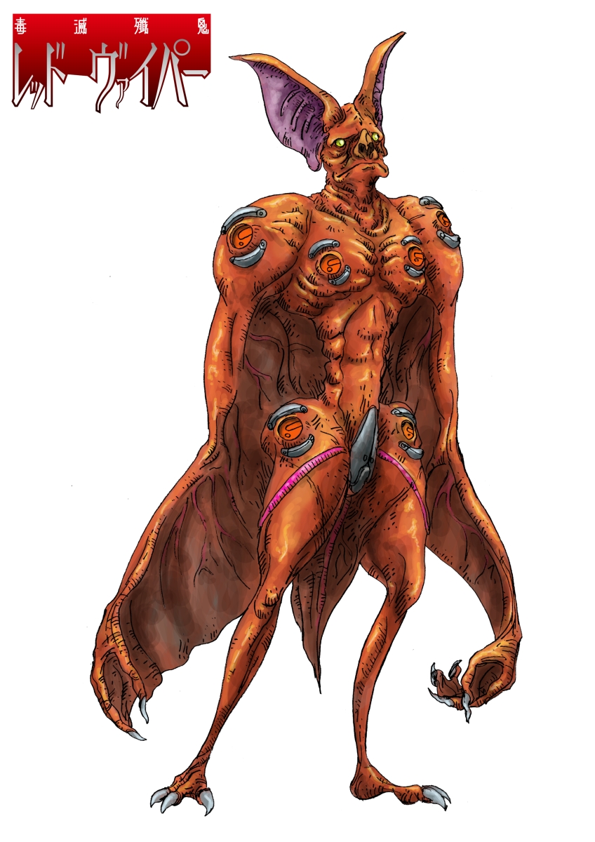 毒滅殲鬼レッドヴァイパー Sonic Bat 投稿者: murbo 投稿日: 2019/03/072022/06/23 コウモリ怪人。本物のコウモリと手の骨格が違っている。本物は手が大きく広がって幕が発達して羽のようになっている。あれだと手が人のような機能を持たせられないので腕から体にかけての幕が発達しているようにした。超音波で攻撃する。 シャープペン0.9mmのドローイングにprocreate(iOSアプリ)で着色。 Readers who viewed this page, also viewed:BLOODSUCKER ELEPHANTイモリ怪人 関連記事: Zombie Bat BLOODSUCKER ELEPHANT イモリ怪人